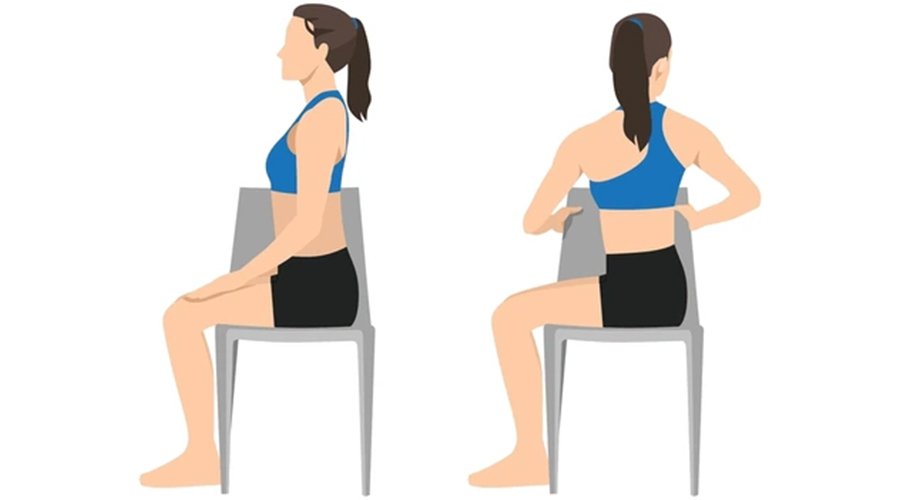 How to do it: Sit up straight with feet flat on the floor. Inhale deeply, and as you exhale, gently twist your upper body to the right. Place your left hand on your right knee and your right hand on the chair back for support. Hold for 2-3 breaths, then return to center. Repeat on the left side.